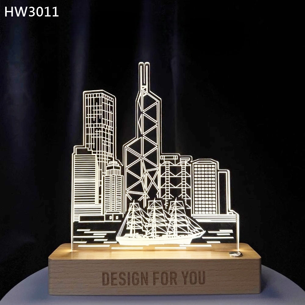 香港地標雕刻亞加歷燈板配實木底座,